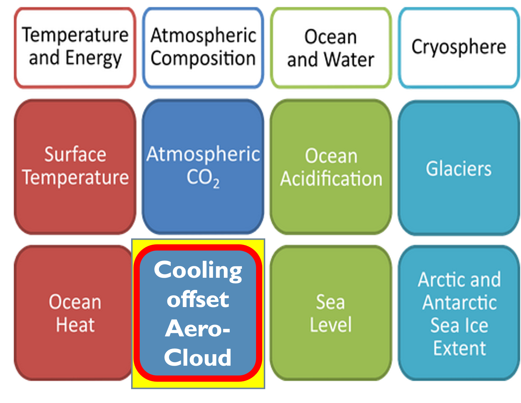 This activity aims to visualise the greenhouse gas warming concealed by aerosols and clouds developing a new climate indicator ‘aerosol / cloud cooling offset’. This aerosol overall cooling has contributions by direct (aerosol presence) effects and by indirect effects - mainly through aerosol modified water clouds. Global, long-term satellite data records will be used to demonstrate the feasibility of a method to derive a new climate indicator which enables monitoring the cooling offset due to (anthropogenic) aerosols and (aerosol modified) clouds. This new indicator would complement the existing WMO climate indicators based on off-line (dual call) two-stream radiative transfer simulations Kinne, 2019.